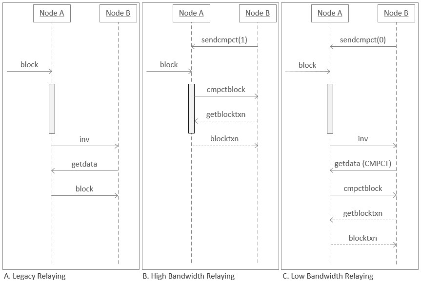 The protocol is intended to be used in two ways, depending on the peers and bandwidth available, as discussed [[#Implementation_Details|later]]. The "high-bandwidth" mode, which nodes may only enable for a few of their peers, is enabled by setting the first boolean to 1 in a sendcmpct message. In this mode, peers send new block announcements with the short transaction IDs already (via a cmpctblock message), possibly even before fully validating the block (as indicated by the grey box in the image above). In some cases no further round-trip is needed, and the receiver can reconstruct the block and process it as usual immediately. When some transactions were not available from local sources (ie mempool), a getblocktxn/blocktxn roundtrip is necessary, bringing the best-case latency to the same 1.5*RTT minimum time that nodes take today, though with significantly less bandwidth usage.